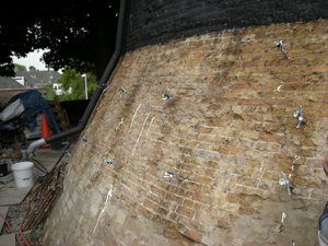 De holle ruimten die meer aan de oppervlakte zijn ontstaan als gevolg van zwelling en krimp tussen de gemetselde schillen, hebben wij opgevuld met een kalkinjectielijm.