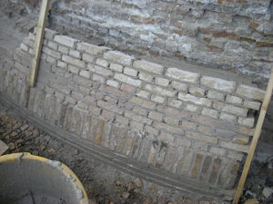 | geval voorzien van een cementpleister, vervolgens werd deze pleister voorzien van koolteer. Opgezogen grondwater kon hierdoor niet meer via de buitenkant uittreden. |