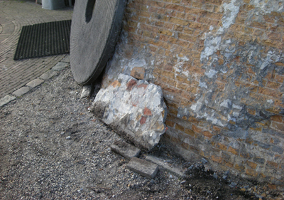 Op maaiveldniveau is het metselwerk nu voorzien van een rollaag bestaande uit IJsselsteentjes, met als doel de kalkpleisterlaag minder kwetsbaar te maken voor optrekkend en opspattend vocht.